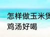 1、材料:鸡半只,玉米一条,姜5片,水适量,酒少许,盐适量。 2、玉米洗净剁块备用。 3、鸡剁块备用。 4、姜切片备用。 5、锅中放入水煮 ....